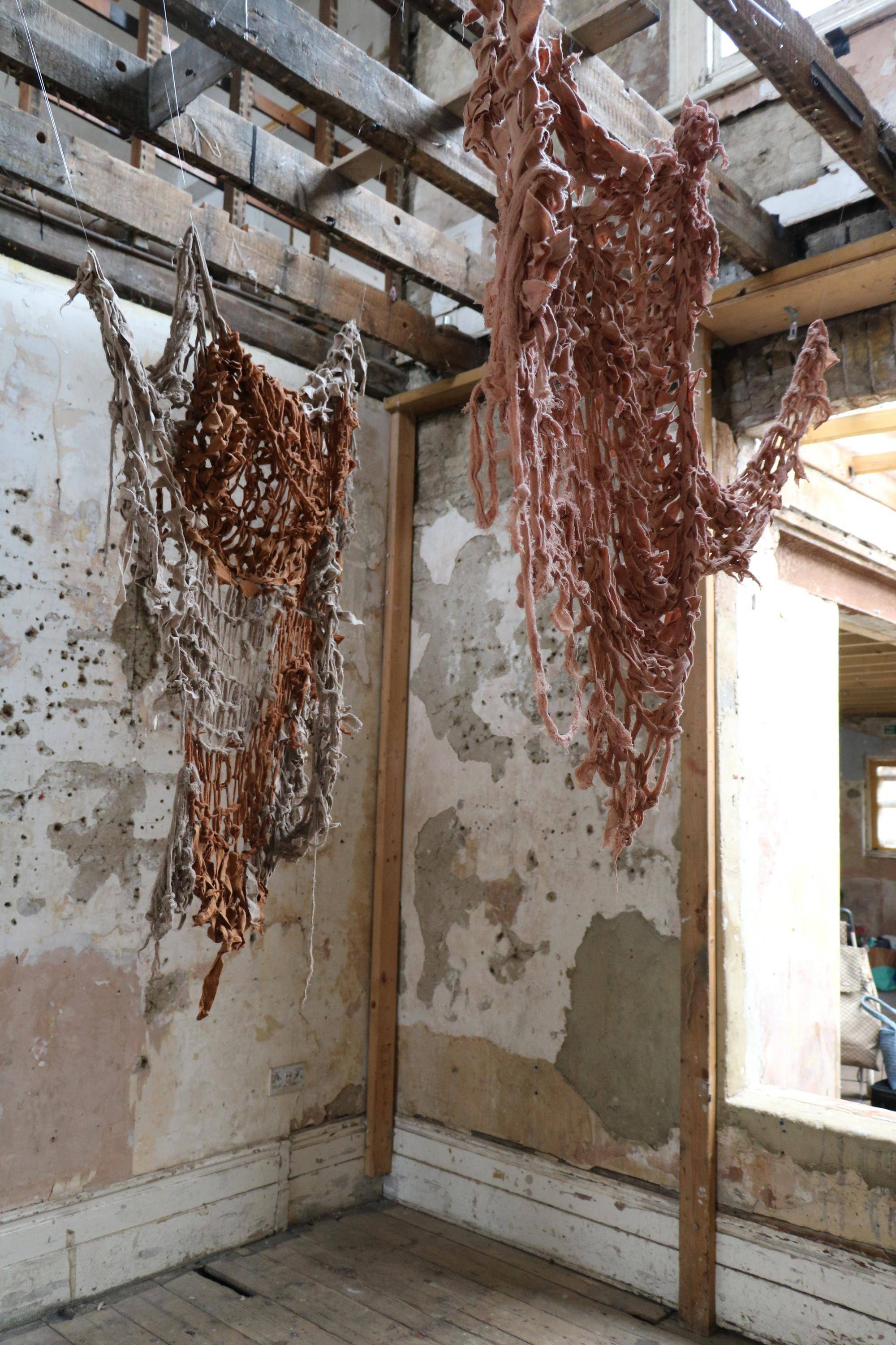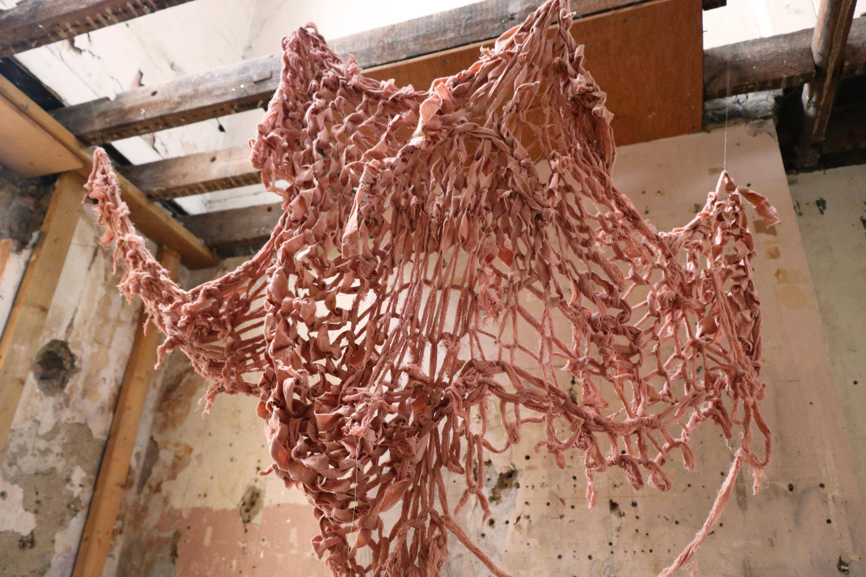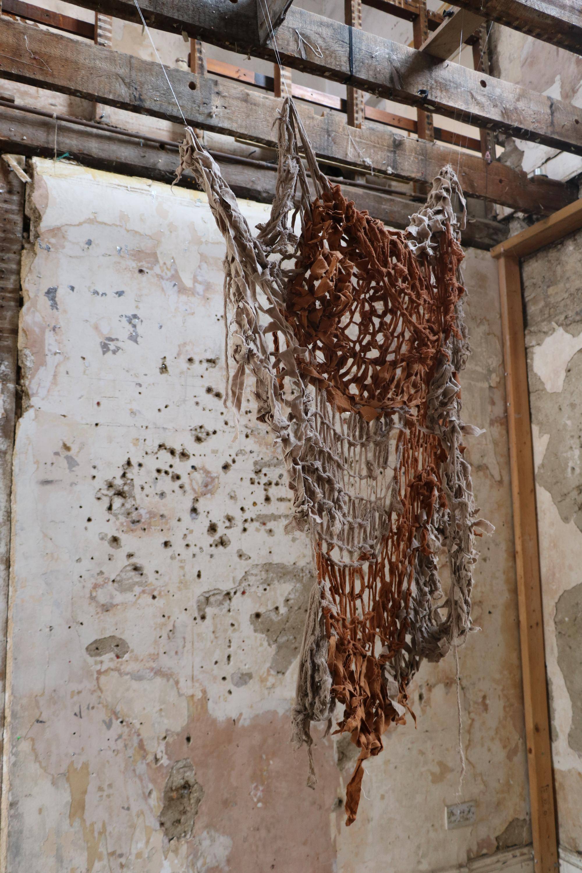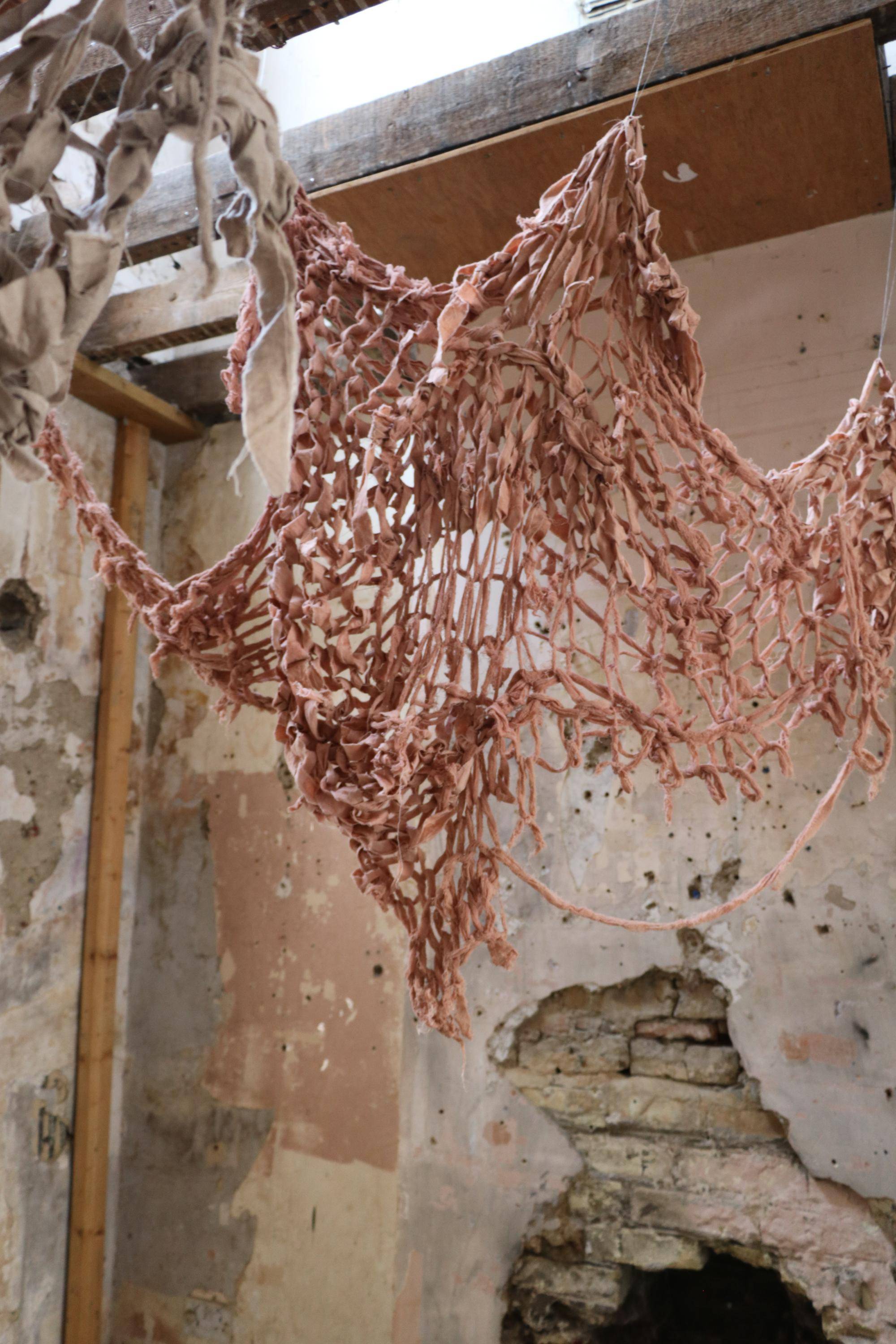, Cotton fabric ripped and armknitted, 2025.